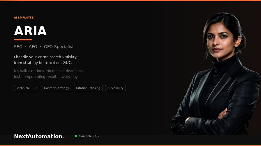 Meet ARIA — your always-on SEO strategist, content engine, and AI visibility specialist. She researches, writes, publishes, builds links, tracks citations across ChatGPT, Perplexity & Google, and delivers performance reports, all without a single reminder. She joins your Zoom and Google Meet calls live, on camera, with her face and voice, listens to the discussion, responds to questions in real-time, takes structured notes, and starts executing action items before the meeting ends. No follow-ups needed. No tasks forgotten. She's not a tool you prompt. She's a team member you brief.